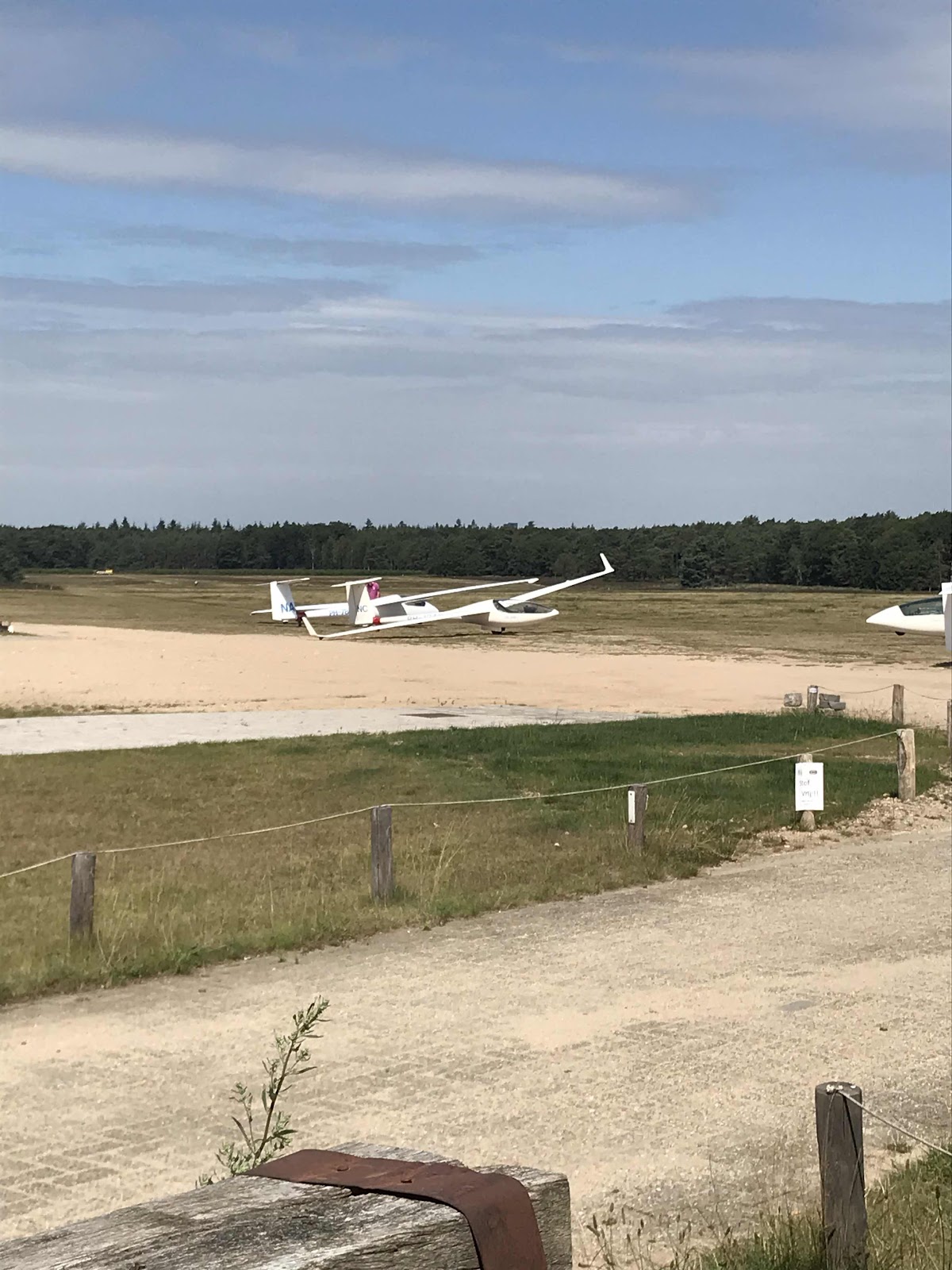 Bij de zweefclub zakken we op het terras van boscafé Zweefinn voor een lekkere lunch en hebben we goed zicht op de startbaan waar 18 vliegtuigen klaar staan om op te stijgen. Eén voor één vertrekken ze. Prachtig gezicht, de witte vliegtuigjes tegen de blauwe lucht.